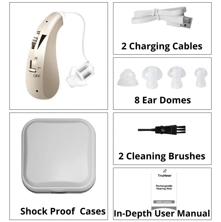 Inside every box, you’ll find everything required to start your journey toward effortless hearing — no extra parts, subscriptions, or setup headaches. Just charge, fit, and enjoy the clarity you’ve been missing.
